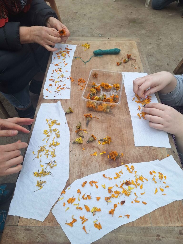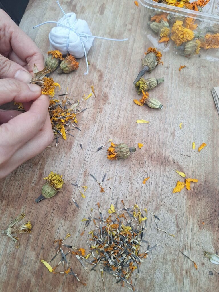 Using dried marigold petals from last year’s crop, we experimented with ‘bundle dyeing.’ We sprinkled the vibrant petals onto fabric and rolled them into tight spirals. Participants took these bundles home to gently steam, revealing unique, nature-printed patterns on the cloth!