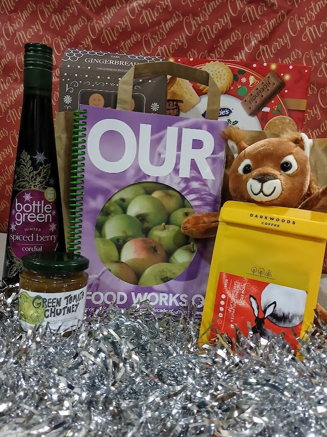 Each hamper includes a delicious selection of goodies, including the ‘Our Food Works’ cook book and our homemade green tomato chutney.